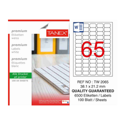 Etichete albe autoadezive, repozitionabile, 65/A4, 38.1x21.2mm, 25 coli/top, TANEX, colturi rotunjit