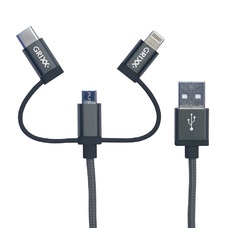 - Cablul de date Grixx 3-in-1 este potrivit pentru incarcarea si sincronizarea tuturor tipurilor de echipamente cu conector Lightning, micro USB sau USB-C.