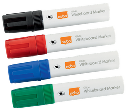- Markere glisante NOBO Glide jumbo, cu linii groase si precise, atunci cand sunt folosite pe table cu stergere uscata si suprafete neporoase ca si tablele din sticla sau otel emailat.