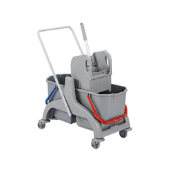 - Carucior de curatenie profesional cu galeata dubla si storcator, ideal pentru igienizarea suprafetelor mari in spitale, hoteluri sau centre comerciale. Designul robust si sistemul cu doua cuve permit separarea apei curate de cea murdara, asigurand o curatare eficienta si igienica. Caracteristici Principale Capacitate Generoasa: 50 litri in total (2 galeti x 25 litri), perfecta pentru trafic intens. Storcator Profesional: Dotat cu presa pentru mop plat, eficientizeaza timpul de lucru si reduce efortul fizic. Manevratibilitate Maxima: Cele 4 roti pivotante si manerul ergonomic permit deplasarea usoara chiar si in spatii inguste. Constructie Durabila: Cadru din plastic dur si elemente rezistente la uzura zilnica si la socuri. Sistem Modular: Mijloc demontabil si componente usor de intretinut. Specificatii Tehnice Tip produs: Carucior curatenie profesional Capacitate: 50 Litri (2 x 25L) Dimensiuni: 74 x 43.5 x 44 cm Greutate: 8.5 kg Dotari: Storcator mop plat, maner mobil, roti pivotante Culori: Gri, rosu, albastru